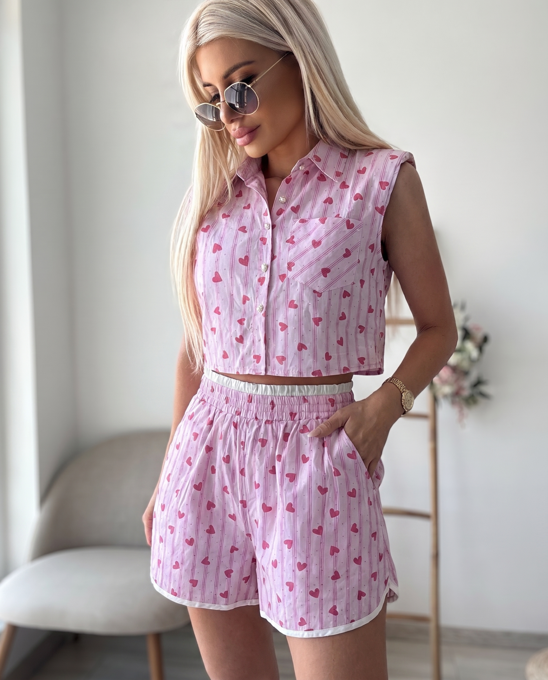 Стилен дамски комплект от две части – риза без ръкави и къси панталонки, декориран с фини камъчета за деликатен блясък. Ризата е с класическа яка и копчета отпред, придаваща елегантен и подреден вид, докато панталонките са с висока талия и ластик за максимален комфорт и свобода на движение. Леката и приятна материя го прави идеален избор за топлите дни.