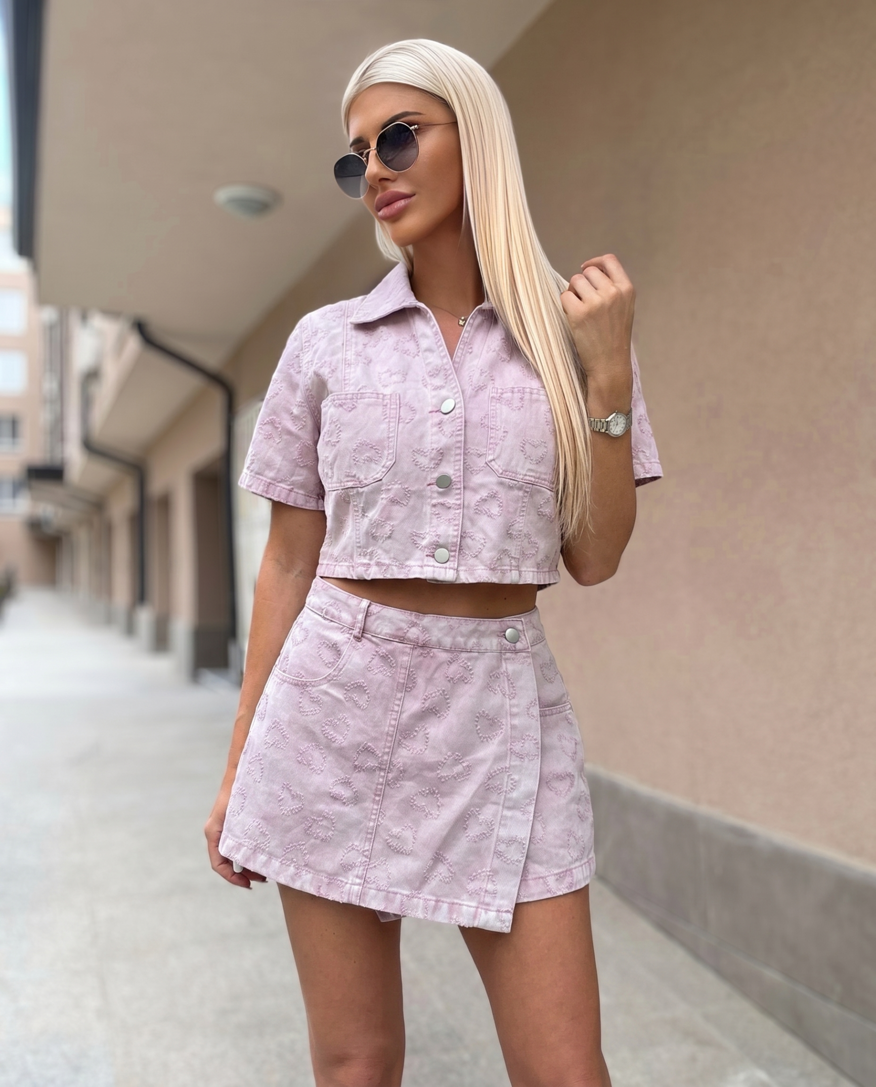Дамски дънков комплект от две части – късо яке-риза и пола-панталон, съчетаващ модерна визия и практичност. Горната част е с класическа яка, къс ръкав и копчета отпред, придаващи леко спортно-елегантен стил. Долната част е тип пола-панталон, която осигурява комфорт и свобода на движение, като същевременно запазва женствената линия. Моделът е изработен от мека и приятна дънкова материя с деликатен релефен десен, който добавя стилен акцент към визията. Подходящ избор както за ежедневието, така и за по-специални поводи, когато търсите удобство без компромис с визията.