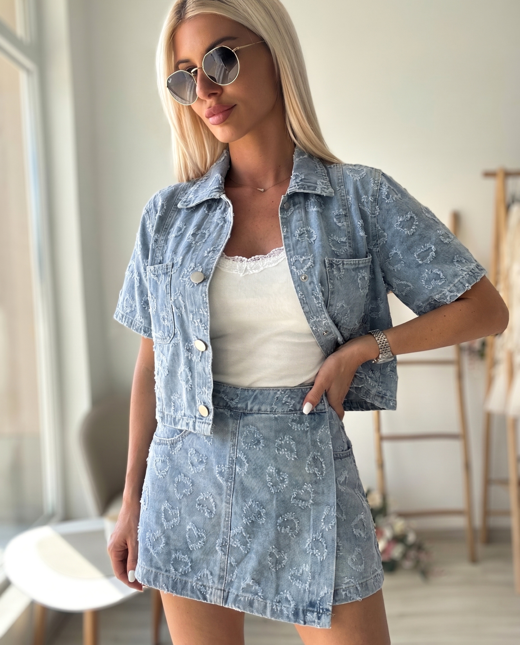 Дамски дънков комплект от две части – късо яке-риза и пола-панталон, съчетаващ модерна визия и практичност. Горната част е с класическа яка, къс ръкав и копчета отпред, придаващи леко спортно-елегантен стил. Долната част е тип пола-панталон, която осигурява комфорт и свобода на движение, като същевременно запазва женствената линия.