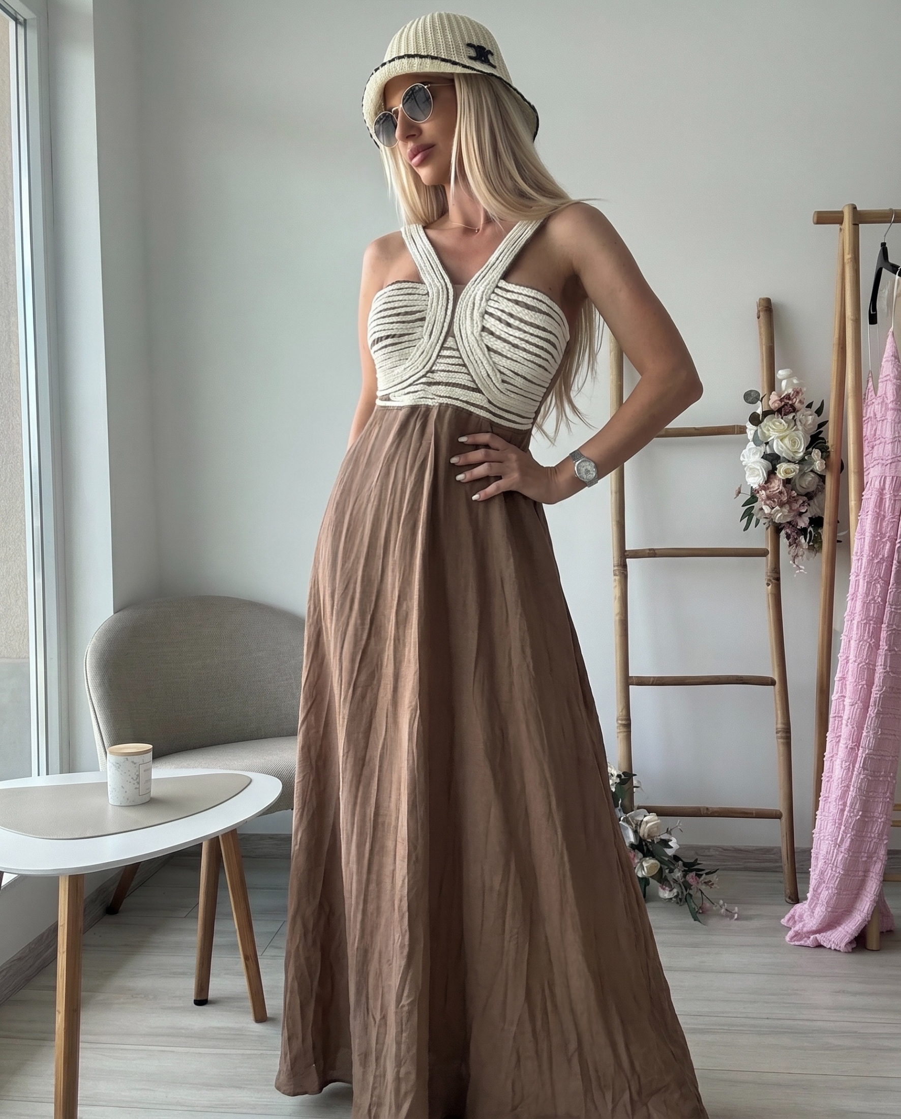 Елегантна дамска рокля от лен с ефирен силует и изчистен дизайн. Горната част е акцентна с преплетени детайли и оформено бюстие, което подчертава деколтето и придава стилна визия. Широките презрамки осигуряват комфорт и стабилност, а високата талия преминава в свободно падаща дълга пола.