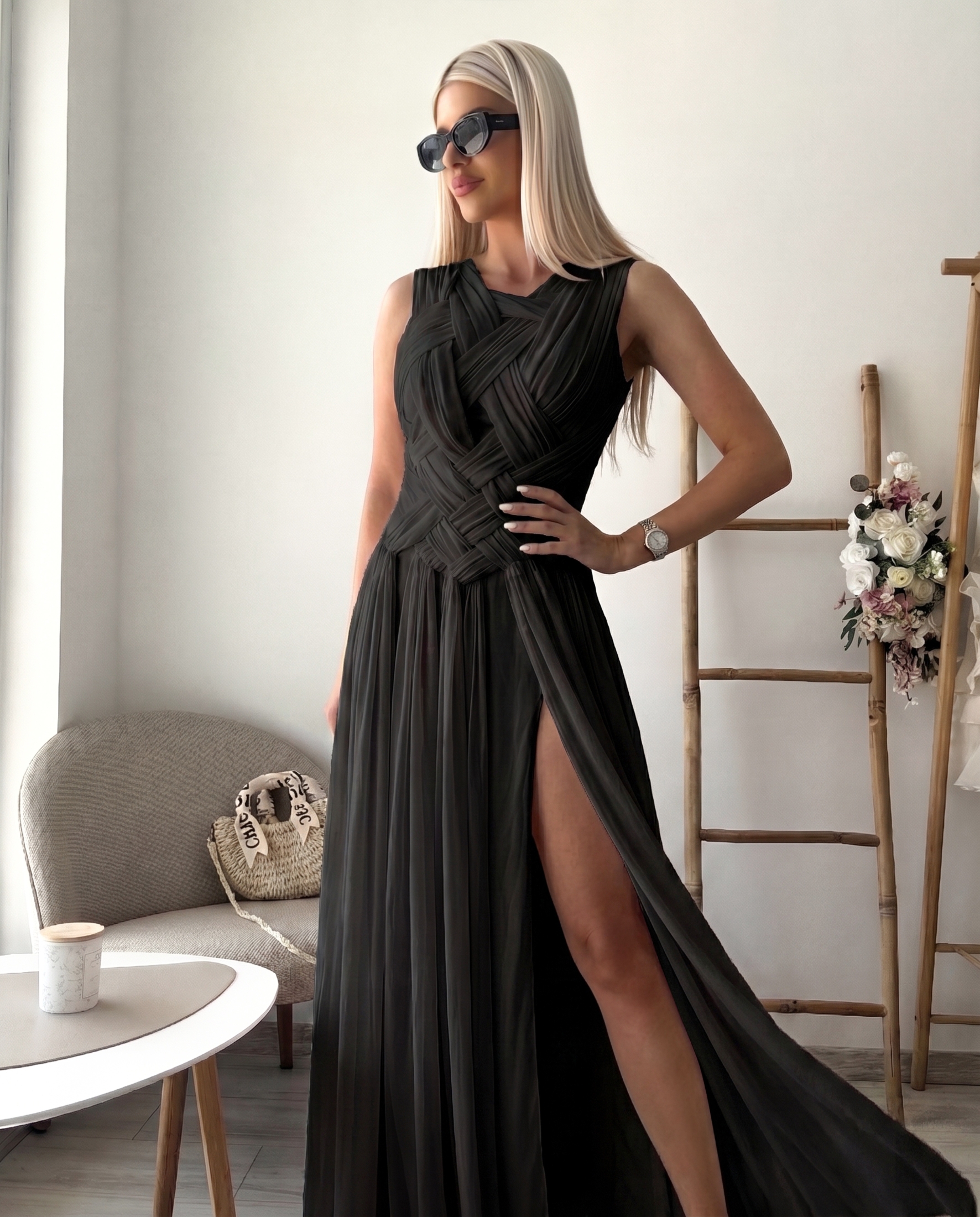 Ефирен и изключително стилен модел, който съчетава модерна визия с нежна женственост. Горната част е с ефектен преплетен дизайн, който оформя силуета и придава отличителен, дизайнерски акцент. Кройката тип къса рокля подчертава фигурата, а фината, падаща материя създава усещане за лекота и движение.