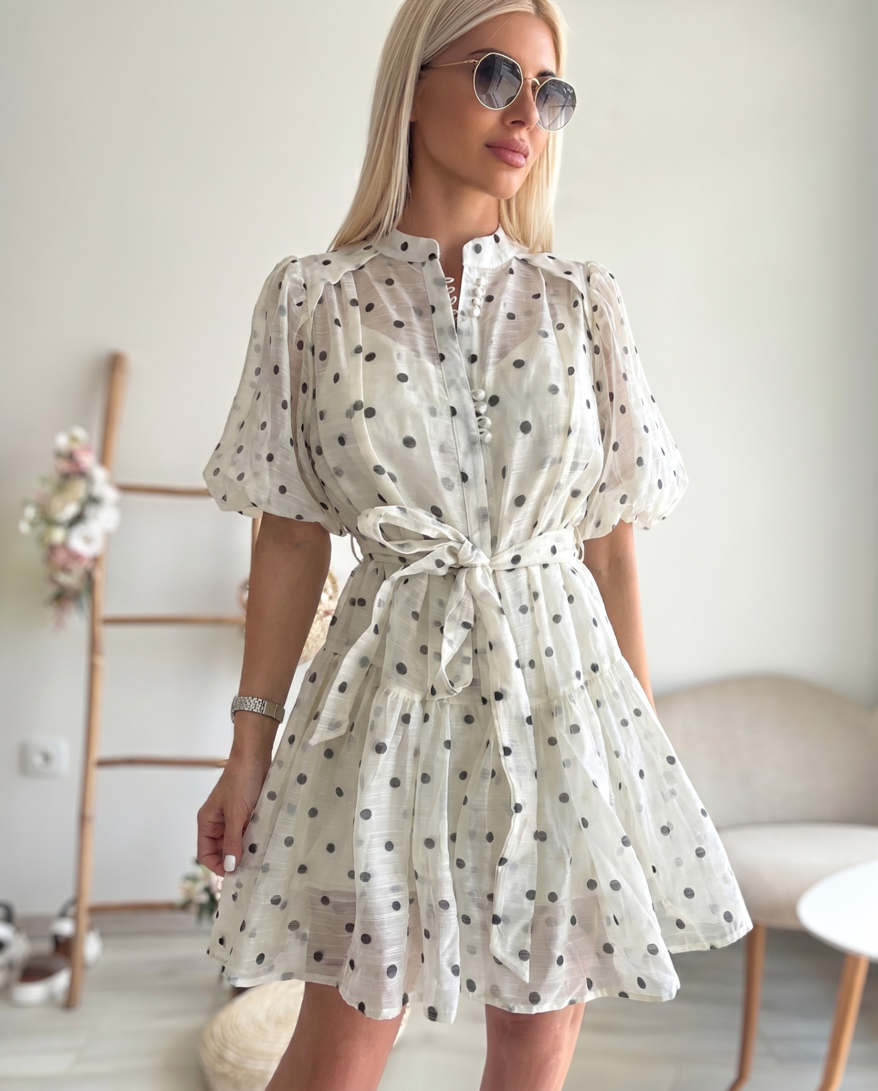 Ефирна рокля с деликатен десен на точки, създадена да подчертае женствеността с лекота и стил. Моделът е с фина полупрозрачна материя, обемни ръкави и елегантно закопчаване отпред с декоративни копчета. Вталяването в талията с колан оформя силуета, а свободно падащата долна част придава движение и нежност при всяка стъпка. Подходяща както за ежедневие, така и за по-специални поводи.